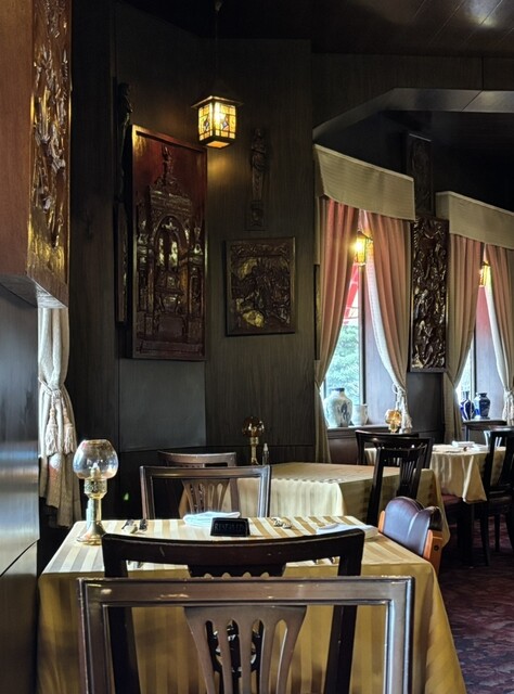 平日のお昼に、友人と2階の席を予約して伺いました。店内は暗めの照明、レリーフの施された格式のある調度品や室内装飾が、厳かで優雅な雰囲気です。入口でコートを預かっていただき、窓際の席に案内されました。11〜12月頃は窓からの銀杏や欅の色付いた景色が素敵だろうなと思いました。お店はオープンしてから61年になるそうです。スタッフさんは、たいへん丁寧でホスピタリティにあふれていました。