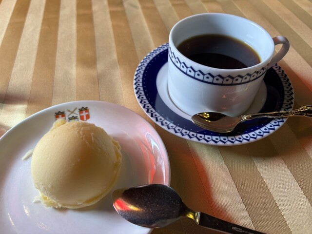 食事にはポテトのポタージュと柚子のシャーベットがつきました。スープはやさしい味でたっぷりと量があり、身体が温まりました。シャーベットは柚子の味が濃く爽やかでした。コーヒーはおかわりを勧めていただき、おかげでゆっくりとした時間を過ごすことができました。
