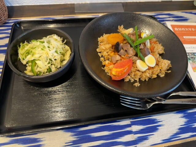 ドライフルーツとラム肉が入ったピラフで米はかなりサラサラでそこにラム肉や野菜やたまごなどが…