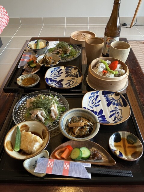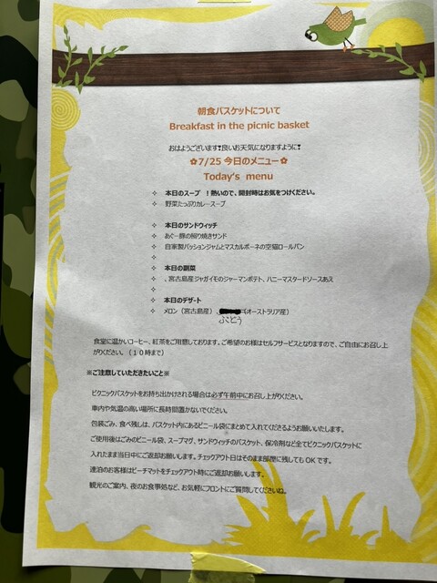 コロナ禍以降、朝食はバスケットスタイルになりましたが、とてもよく考えられており、お部屋でのんびり頂くも良し、近くのビーチやお気に入りの場所で頂くも良しです(私達はいつも部屋ですが・笑)夕食は希望制で毎日はありませんが、2,500円でしっかりした和定食が頂けます。地のものを多く使っていて、宮古島を感られるところも良いです。夕食も一階の小上がりスペースでも、部屋でも頂くことが出来ます。こちらのお宿でのんびりビールを飲みながら、美味しいお料理を頂くのが至福の時です。