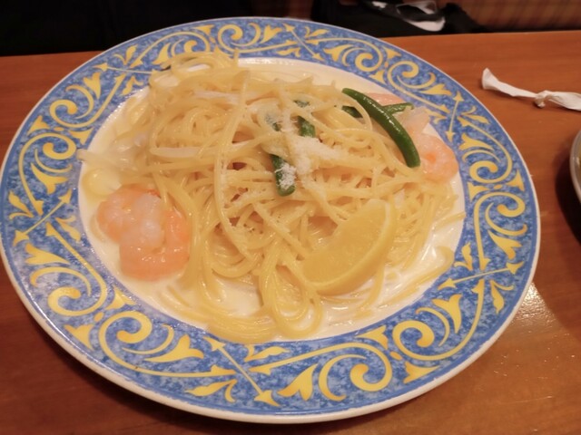 3名で来店させて頂き、プリプリ海老とベーコンのピリ辛風パスタ、濃厚カルボナーラ大盛り、海老のレモンクリームパスタ大盛り、デザートセット2つ、ケーキセット1つ注文。