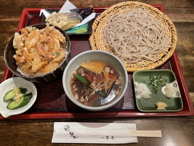 昼限定セットの「百合セット」@1,320鴨汁そば、かき揚げ天丼に天ぷら3品:はす・なす・舞たけ@550を注文しました。なすの天ぷらが美味しいです。