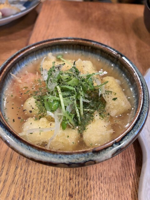 ここのお店は揚げだしがたくさん種類があり、モッツァレラの揚げ出しとつぶ貝の揚げたしを頼みました。
