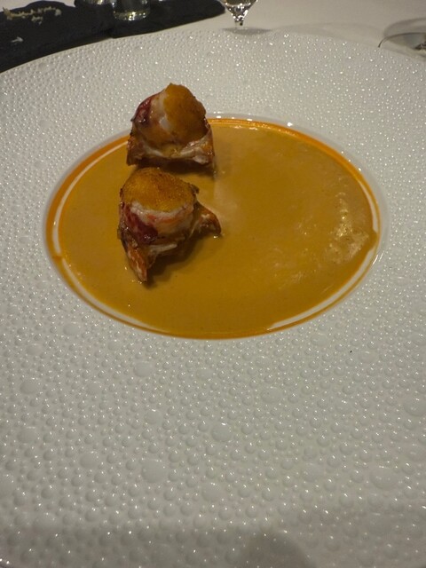 三つのコースの中で一番上をいただきました。ワインは最初に泡で、白、赤と合わせました。伊勢海老のこのソースは大変美味しゅうものです。シャトーブリアンは柔らかく久しぶりに美味しい牛肉を食べました。クレープも自信作とのことですが、目の前でクックいただきましてとても楽しめました。ワインも全く翌日に響かない素敵なものでした。またこれという機会に利用します。