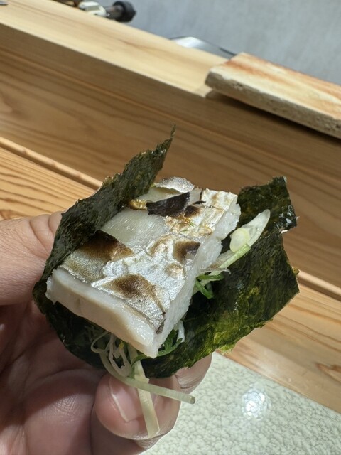 鹿児島のあおりいかは細かく叩かれ、シャリと一体となってほどける。イワシの炙り、千葉の太刀魚、異なる部位を使った二枚重ねのマグロ、香ばしく仕上げられたカツオ。魚の力を引き出しつつ、大将の遊び心も感じられる。