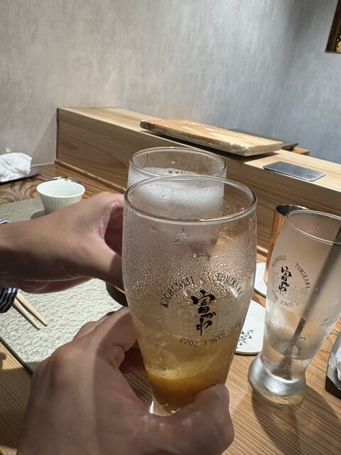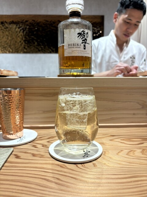 お酒は「富かわハイボール」をはじめ、山崎や響のハイボールも揃い、鮨との相性も抜群。特に漬け込んだ焼きリンゴの風味を纏った富かわハイボールは、ここでしか味わえない一杯。