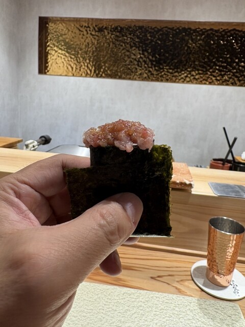 続いて、脂ののったくろむつ(8キロサイズ)、高知の鯵、信州の水茄子の巻物は、生ハムをあしらった一品。さわらの燻製、愛知のいしきうなぎの巻物。うなぎは香ばしくパリパリの皮とタレで、身はほろりと崩れる。ほっき貝の歯ごたえ、大トロの手巻き寿司に山牛蒡が効いた一本。締めに「いなり寿司?!」が登場し、コースが完成したことを実感させる。