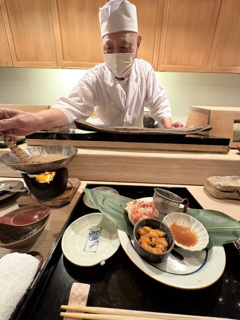 鯛出汁に沈められた香箱蟹は、湯の中で色を帯びながらゆっくり息を吹き返すようで、そこに雲丹をのせて口へ運べば、蟹の甘み、雲丹の濃厚なコク、出汁のやわらかい塩味が、ひとつの景色になるように溶け合っていく。