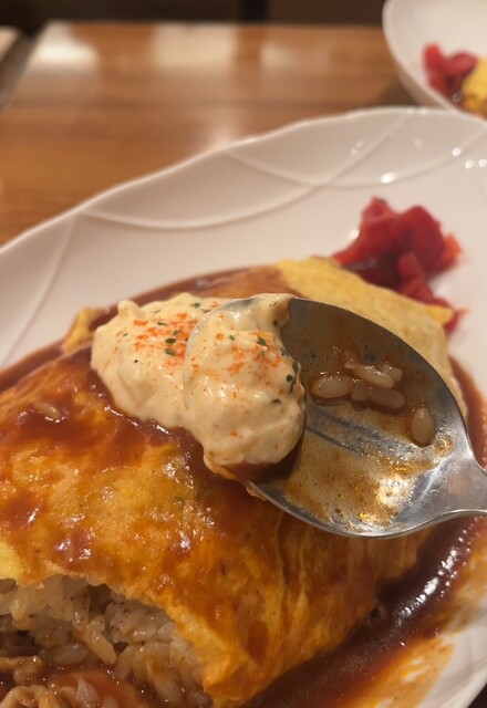 そしてソースは、酸味のある薄めのデミグラスソースのよう。そしてトップには、タルタルソース。このドライカレー×デミグラス×タルタル、これがオムライスになることでまさに三位一体のハーモニーを奏でててる。これはここでしか味わえない。そりゃファンも多いわけだ、納得です。