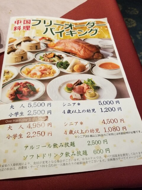 ホテル価格ですね。One Harmony会員(無料)に入っておくと、割引されるのも勿論、北京ダックが食べ放題になり、ホテル日航でのポイントも貯められてお得感満載です。