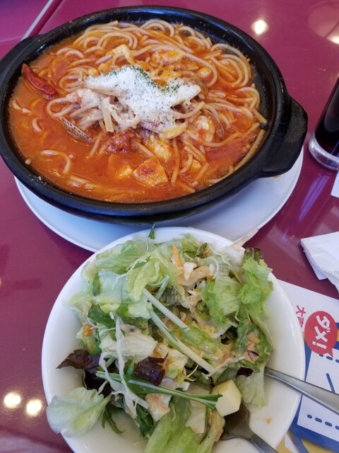 カリブリア風(麺M200g)1090円+麺(LL㌘は!?)270円 Aセット「ミニサラダ+ドリンク」+480円。土鍋でグツグツ熱々で出てくる辛いシーフードの出汁の効いた絶品。太麺2㎜位パスタ。