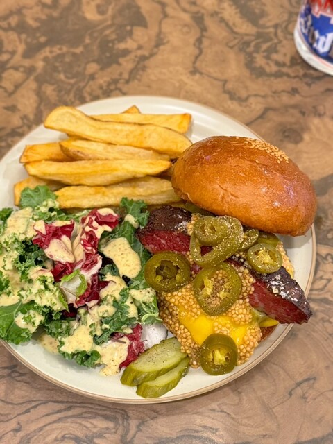旨みが溢れる熟成和牛から作られたパティと分厚くホロホロのパストラミが自家製マスタードで纏まり旨い!