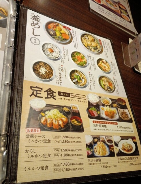 大雄山線の大雄山駅から左手に出て、少し歩いていくとあります。釜飯やステーキ・ハンバーグなどの鉄板焼きなどが名物のお店ですが、迷った末、今回は『おろしミルかつ定食150グラム』¥1,738を食べました。小鉢、香の物、ご飯、味噌汁付きで、とても美味しかったです。今度は、釜飯も食べてみたいです。