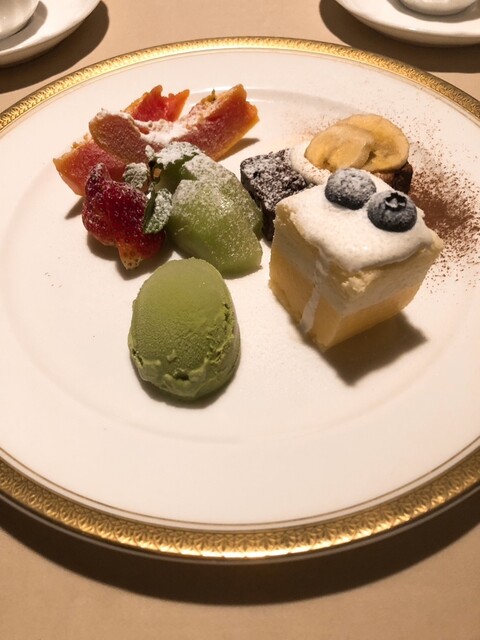 ワゴンサービスで仕上げの調理をしてくださいました。絶妙な柔らかさと塩気のある絶品なお肉でした。が、ボリュームがありすぎて少し残してしまいました。非常に美味しいお料理なのですが、フルコースの後半でこのボリュームはかなり厳しいと思うので、次回はもう少し考えて注文しようと反省しました。