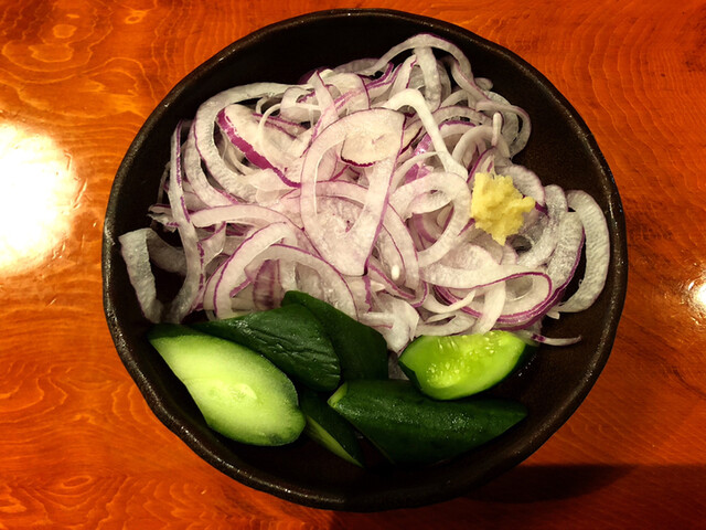 食べ放題の漬け物が相変わらず美味しかったです。夏限定の薄くスライスされた辛味のない玉ねぎに出汁醤油?をかけて食べました。