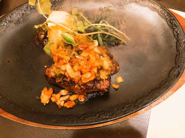 熱々の鉄板の上で食べるレアなステーキは相変わらず柔らかくすごく美味しかったです。