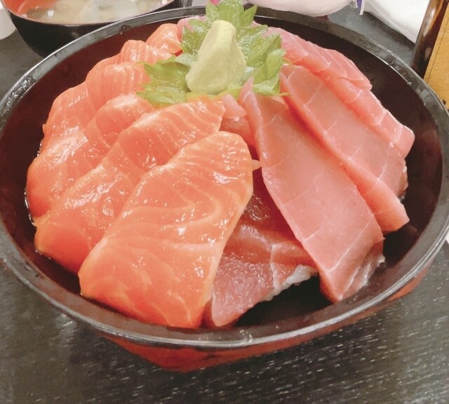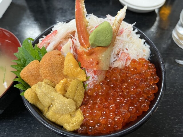 マグロサーモン丼、三食丼(生ウニ、カニ、いくら)、三食丼(甘エビ、いくら、ホタテ)とビールをオーダー。