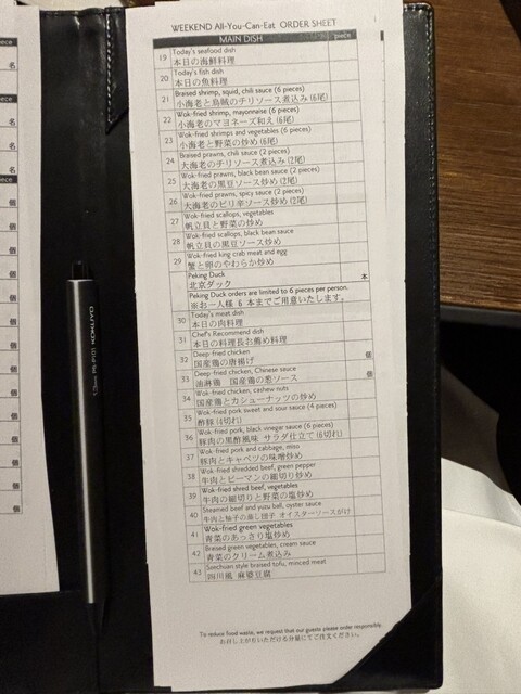 オーダー用紙に必要分を記入して、テーブルの端に置くとお部屋の外に控えてくださっているスタッフさんがすぐに回収してくれるので、こちらから声をかけることは全くありませんでした。