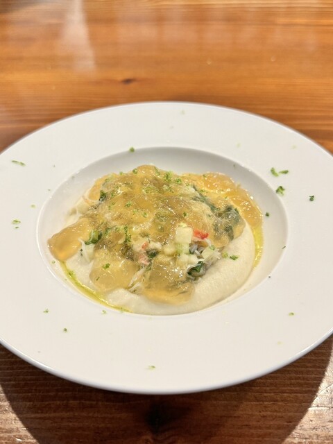 •魚介と甲殻類のコンソメジュレ ズワイガニのほぐし身 林檎と根セロリのムース 高知県産青柚の皮