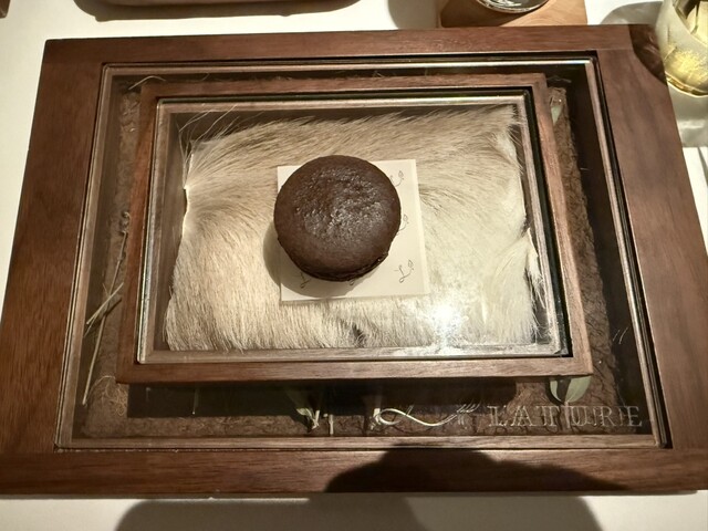 この店のテーマは「自然」で、ジビエ料理が中心のメニューとなっています。最初に登場したのは「鹿の血のマカロン」。ミシュランガイドでも紹介されている名物料理です。全体的に暗赤色で、外側はサクッとしたマカロンの甘さ、中心部は少し塩気があり、甘じょっぱいバランスが絶妙。鹿の血の独特な臭みは感じられず、よく味わうとほのかに血の風味が残る程度で、味・見た目・食感すべてにおいて完璧。今回のコースの中でも一番のお気に入りで、本当に美味しかったです。
