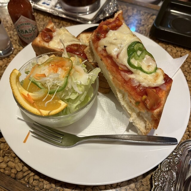 お昼を食べてから夕飯まで時間が空きすぎるスケジュールだったので、Wピザトーストも注文。パンが2枚重なっているからWみたい。分厚いのに、ふわふわのパンが2枚なので、食べ応えも!
