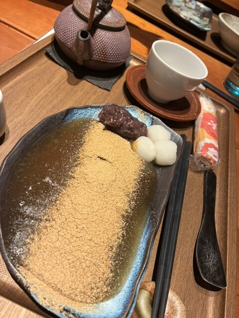 抹茶と和三盆のわらび餅、ほっかほかでやわやわ。もちもちすぎてスプーンですくうのが大変なほどです笑