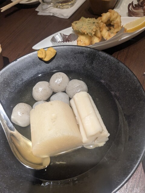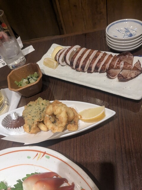 夕方5名で行きました!飲み放題食事5品付き2500円も良かったけど、今回は食事メインで、焼き鳥お刺身おでん皿うどんいか焼きなどなど。それでも日本酒1本、ビール5杯、酎ハイ7杯で1人3200円は安い!