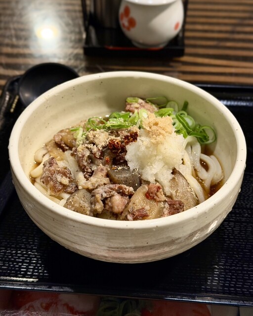 牛すじうどん 冷、菜の花からし和え、しいたけ網焼き