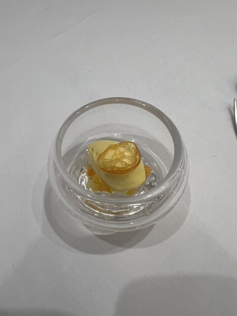 メニューはアミューズ、鰆(お刺身の皮目を少し炙った料理)、オマール海老とトリュフの料理、菊芋のスープ(白子が一つ入っている)、キャビアの乗った真鯛、信州プレミアム牛リブロース。デザートとして金柑のシャーベット、苺大福。最後に紅茶(バタフライティーorアップルティー)とフィナンシェとシナモンスパイスが練り込まれたカスタードのタルト風の茶菓子でフィニッシュ。