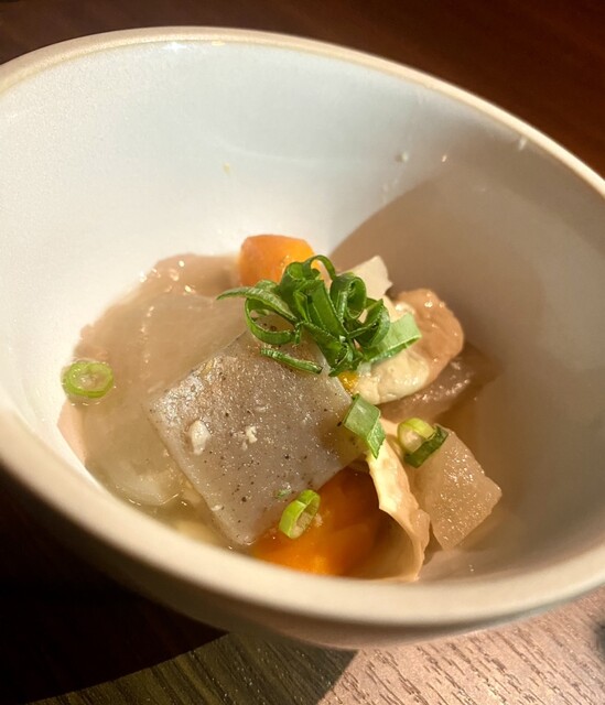 レモンを皮ごと香味野菜と一緒にすりおろしたものを付けていただきます。