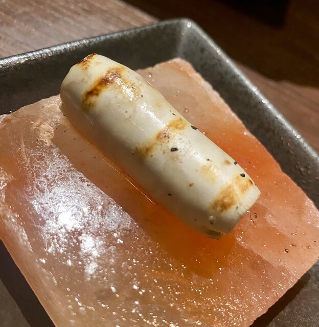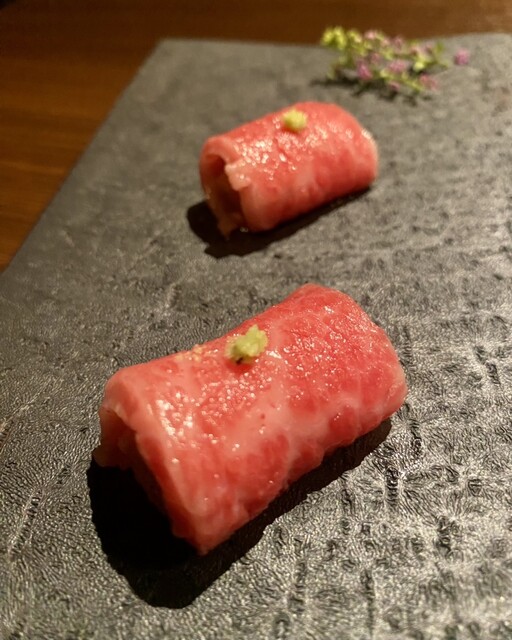 和牛は軽く炙っており、口に入れると豊かな脂の旨みと泡醤油のほのかなしょっぱみが広がる。