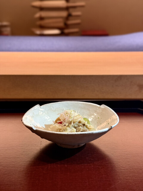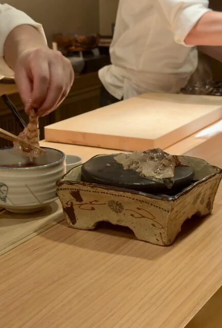 煎り酒につけることでさらに深いコクが加わり、素材の良さを最大限に引き出す組み立てで、繊細かつ力強い味わいが楽しめる完成度の高いお造り。