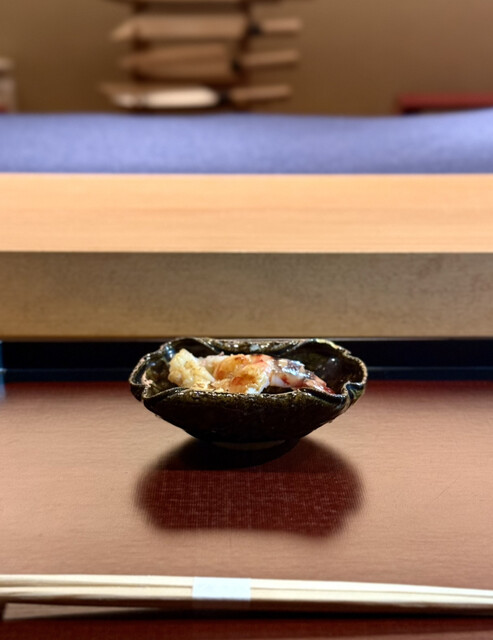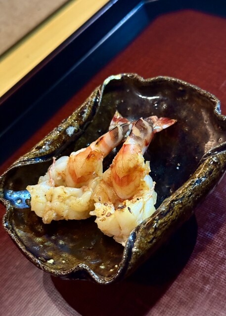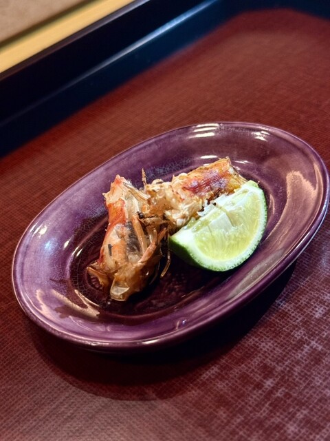 身を味わったあとは頭が香ばしく焼かれて登場し、殻ごと味噌の濃厚な旨みまで堪能でき、海老の魅力を余すことなく味わえる一皿。
