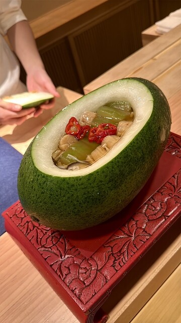 冬瓜を器に見立てた見た目にも涼やかな一品で、冷たい出汁が夏の体にじんわりと染み渡る。