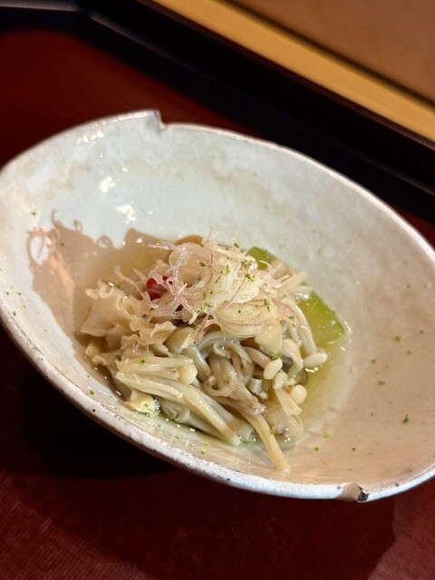 椎茸・榎・しめじ・花びら茸といった多彩な木の子に、薬味の茗荷が加わり、食感の違いが楽しく、味わいに奥行きを与えている。