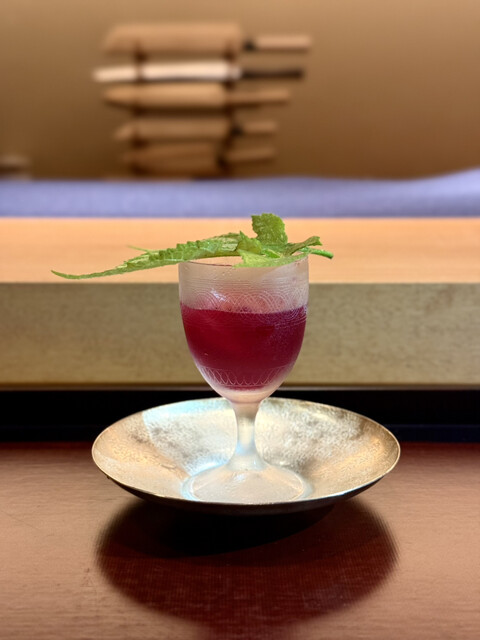 赤紫蘇ジュースに始まり、目板鰈や雲丹、鰻、黒毛和牛など季節感あふれる品々が次々と登場し、目の前で繰り広げられる鮮やかな仕上げの演出にワクワクが止まらない。