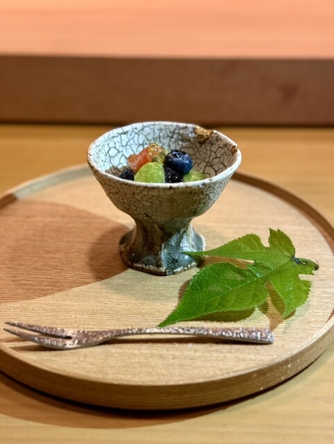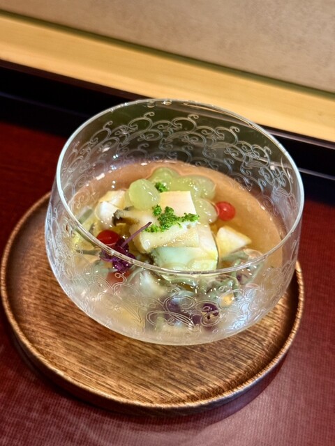 とても小さいのに味がしっかりしているマイクロトマトをはじめ、鮑・山芋・トマト・デラウェアと、それぞれ異なる食感の組み合わせが楽しい。