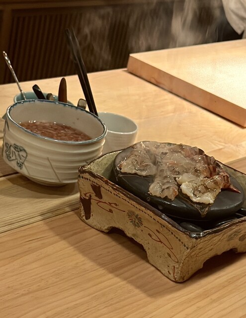 酒盗のコクと旨みが車海老の凝縮された旨みと合わさり、噛むほどに美味しさが広がる絶品で、目の前で石焼きにされるライブ感と絶妙な火入れがたまらない。