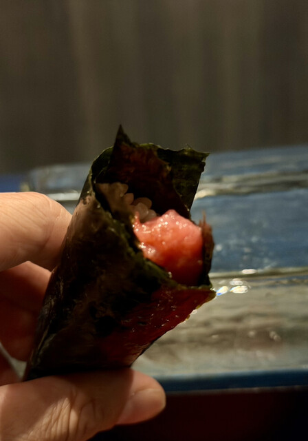 パリッと音を立てる海苔に、希少部位・突先のなめらかな旨み、ふっくらした酢飯が三位一体となり、出だしから驚かされます。