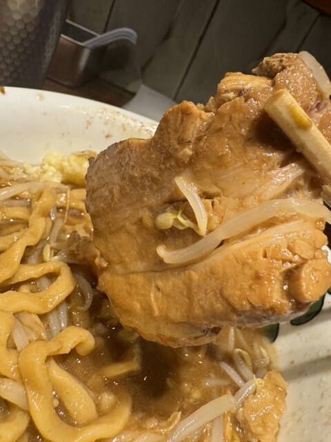 やさい、あぶら、にんにく、バラチャーシュー、極太のワシワシ麺が濃厚なスープとベストマッチ