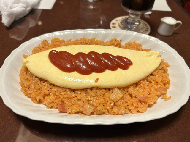 オムライス大盛(100円)+アイスコーヒー(甘め)で1600円。上のオムレツはトロトロかつ少しチーズの風味。