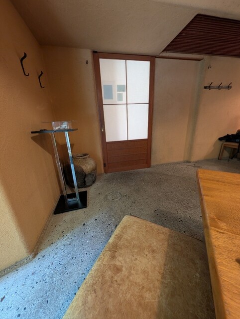 土塗り?の店内は、しっとりと落ち着いた雰囲気。通りに面した大きな窓からは、緑の植え込みが涼しさを演出し、店主のこだわりとセンスを感じさせます。