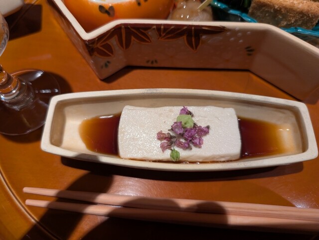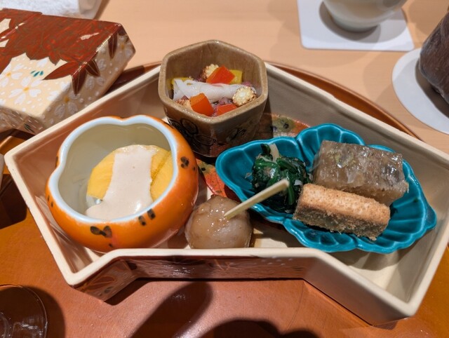 庄内麩、飛騨牛のタルタル、柿なます、ジーマミ豆腐、ホタテの昆布締め