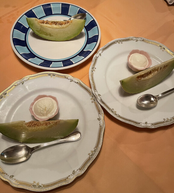 デザートはメロン、女性だとアイスクリームもついてきます、メロンは前回同様甘かったです。