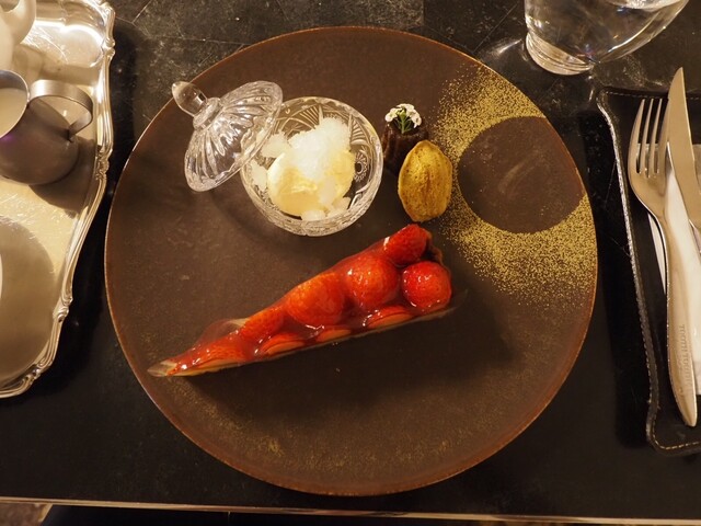ドレスケーキとは、選んだケーキが小さなマドレーヌ、カヌレ、アイスクリームとともにデコレーションされたものです。見た目が素敵でたくさんのスイーツをいただけることにまずテンションが上がりました。マドレーヌは小さいながらも外側のサクサク感が強く中はしっとり。カヌレはカリッカリの外側が香ばしい一方で(カトラリーでは割れず、かじりました)、中はもったりとクリーミーでした。どちらもプチフールですが高級感がしっかりありました。タルトフレーズはアーモンド生地の香ばしさと控えめな甘さに、いちごのしっかりした酸味とが合わさって至福でした。ガラスの容器にデコレーションされたアイスクリームはクリームが濃厚でバニラの香りも高く、でも添えられた柚子のシャーベットのおかげで重さは感じず、とても贅沢な気持ちになりました。アールグレイはベルガモットの香りは控えめでしたが、淡い苦味がとカップに2杯半ほど取れるたっぷりな量を考えるとちょうどよかったかも。