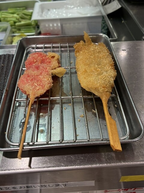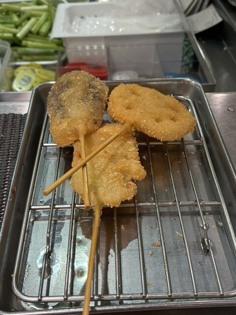 1ドリンク制で、まず飲み物のオーダーを聞かれます。キャベツと取り皿を受け取ったら、あとは好みのままにタマネギ、なす、れんこん、紅しょうが、アジ、うずら、黒豚、はもをお願いしました。季節の味で"はも"があるあたり、さすがに関西だと嬉しくなりました。身はふっくらでジューシーで美味しかったです。串揚げは1本180円からとお手頃で、注文後仕上げで揚げてくれるので、どれもあつあつのサクサクです。細かい目のパン粉の衣のせいか重さを感じません。ウスターソースをたっぷりつけていただきましたが、紅しょうがだけは下味がしっかり付いていたのでしょっぱくなってしまいました。爽やかな酸味とシャクっとした歯触りは美味しかったのにちょっとミスでした。どれも美味しかったですが、トロトロのナス、身が厚くふっくらで味が濃かったアジが特に好みでした。 2、3種類ずつ頼み、合間にキャベツで小休止を入れつついただきましたが、正直まだまだ食べられました。お席が混んできたのとカロリーを考えて自制しました。
