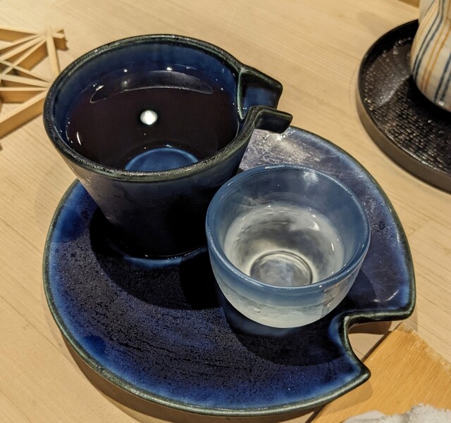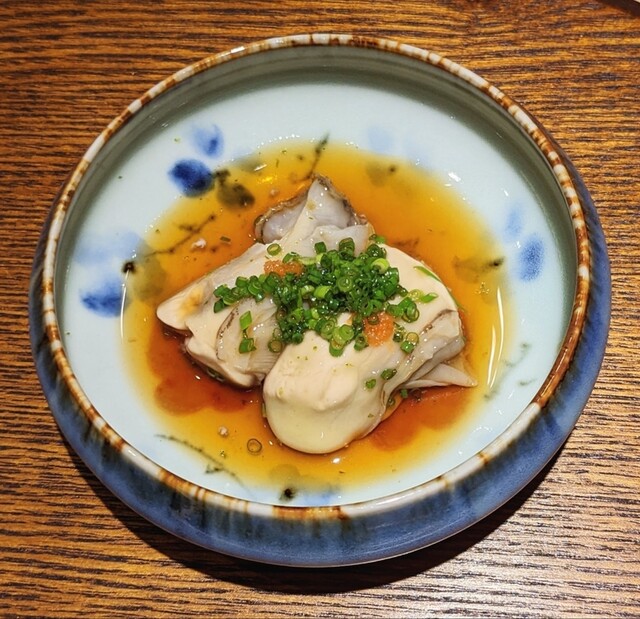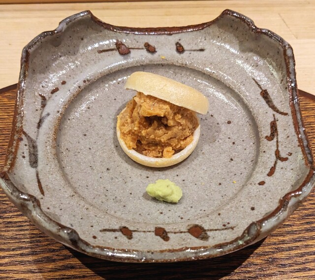 あん肝最中。あん肝に奈良漬を加えてます。半分はそのままワサビと。半分は最中の皮で包んで食感と味の三重奏を楽しめます。