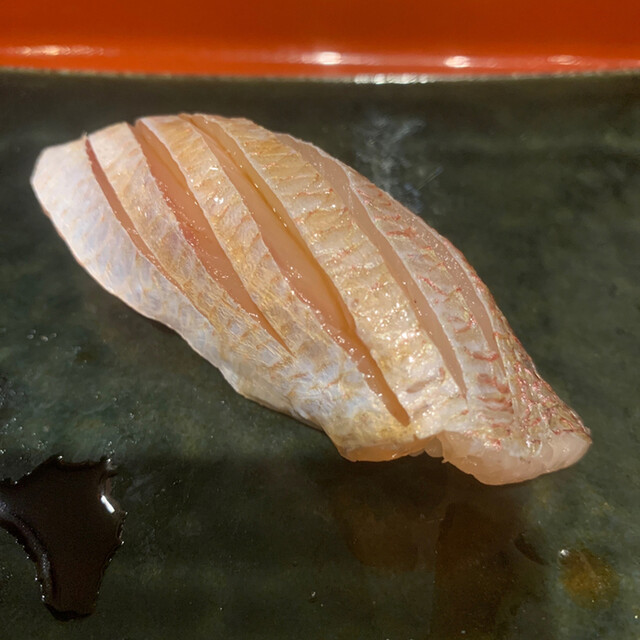 特筆すべきは香りの良さ、しっとりと柔らかさな身質、嫋やかな甘み、そしてやや硬めのムッチリとした皮目とそこから滲む旨味と食感が最高。酸味と塩味も強すぎず。白眉。