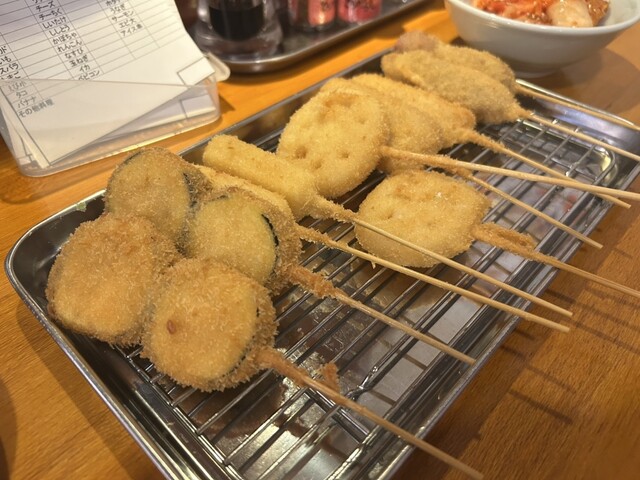 串カツ盛り合わせと桜肉ユッケを目当てに訪問。まず串カツは揚げたてが一本ずつ提供され、衣が軽くサクッとしていて油切れがとても良いのが印象的でした。豚や海老、野菜など種類も豊富で、それぞれ素材の旨みがしっかり感じられます。特に海老は身がぷりっとしており、噛んだ瞬間に甘みが広がりました。ソースも重すぎず、最後まで飽きずに楽しめます。桜肉ユッケは鮮度の良さが一目でわかる美しい色合いで、臭みは一切なし。とろっとした卵黄と絡めることで、桜肉特有のさっぱりした旨みとコクが引き立ちます。薬味との相性も良く、お酒が自然と進む一品でした。全体的に素材へのこだわりと丁寧な仕事を感じられ、カジュアルながら満足度の高い食事が楽しめます。友人同士や軽く一杯という場面にも使いやすく、また再訪したいと思えるお店でした。