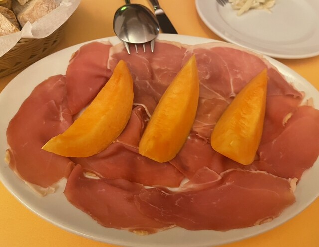 今回は、季節のおすすめからメロンと生ハム、ウイキョウのサラダなどを、定番メニューから自家製ソーセージとタリアータを選びました。